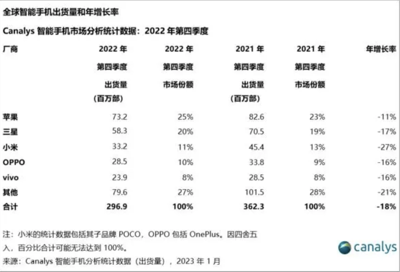 而數日前小米集團的2022年全年業績公告同樣不盡如人意——小米2022年實現總收入2800億元,同比去年下降14.7%,經調整后凈利潤為85億元人民幣,同比去年下降61.4%。其中,占總營收近6成的智能手機業務2022年全年收入為1672億元,收入同比下降19.9%,2022年雖然賣出了1.5億臺、出貨量排名全球第三,但比2021年差了4000萬臺。