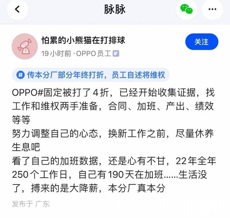 而這次之所以多位OPPO員工“發聲”年終獎問題,是因為近一兩年來,OPPO在內部推出了“全新浮動制”,要求固定薪資員工降低月薪,而后許諾提高年終獎。但是薪資改革完成后的第一年,就出現“年終獎打折”問題,導致年包對比以往大幅降低,因此不少人認為OPPO這個“全新浮動制”就是為了哄騙他們降薪,并試圖繞過原先簽訂的勞動合同。