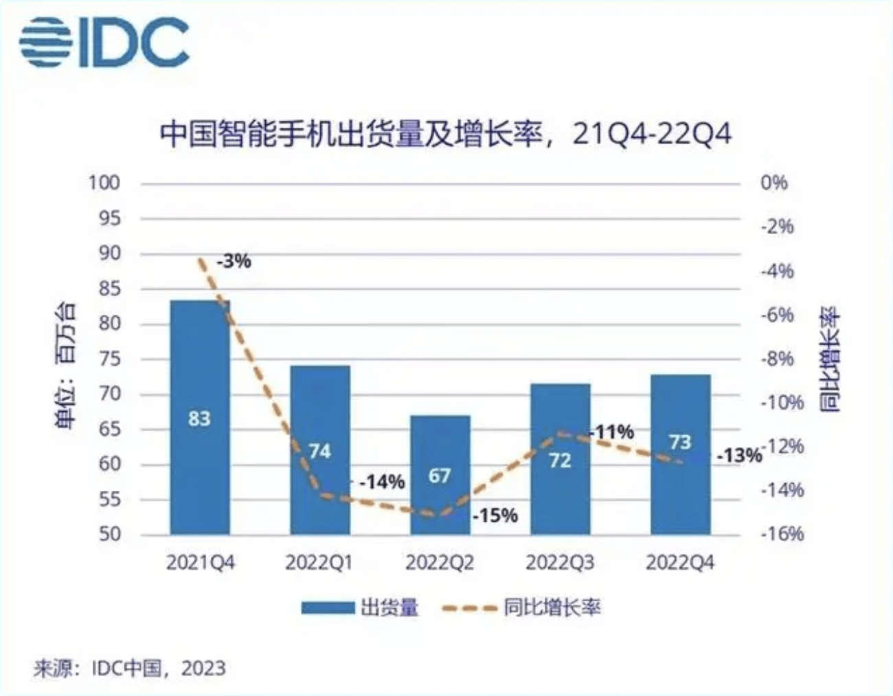 近日,國際數據公司(IDC)手機季度跟蹤報告顯示,2023年智能手機市場仍舊難言樂觀。2023年全球智能手機市場出貨量將會低于12億臺,同比下降1.1%;而中國市場的出貨量預計將僅有2.83億臺,同比也會下降1.1%。