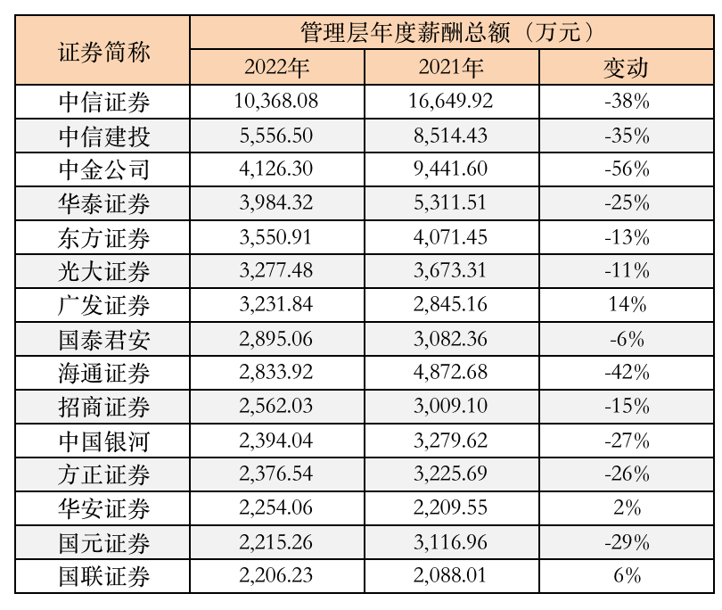 此外,海通證券、中泰證券、中信證券、中信建投高管年度薪酬總額降幅也超過了30%。