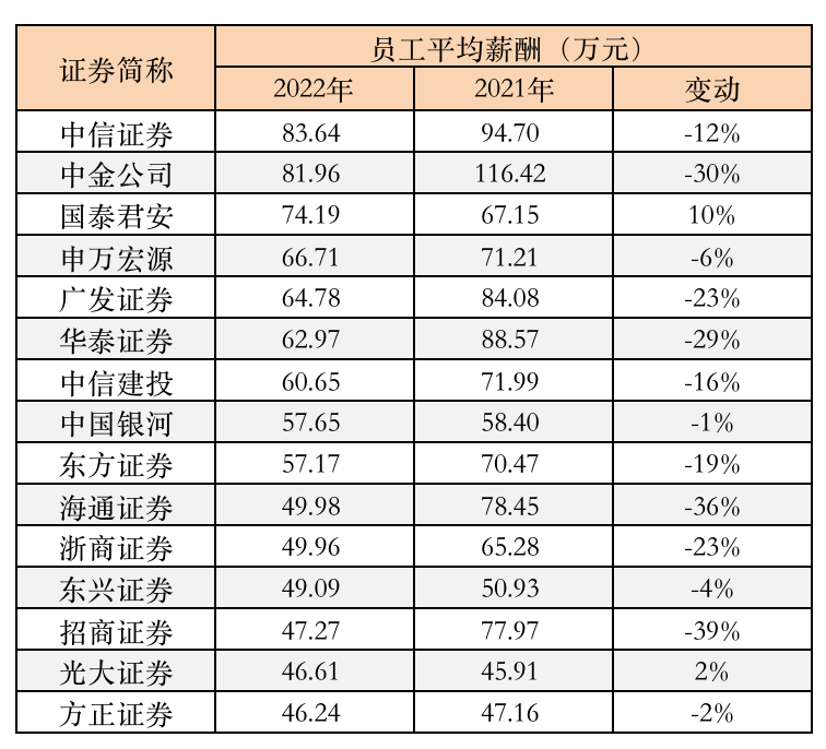 新京報貝殼財經記者根據員工年平均薪酬公式計算,截至目前,9家上市券商員工平均薪酬超過50萬元,其中,“一哥”中信證券以83.64萬元的平均薪酬位列第一。而2021年,28家上市券商的員工平均薪酬超過50萬元,5家超過80萬元。