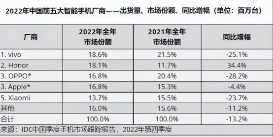 Counterpoint Research報告也指出,2022年,OPPO銷量同比下降高達27%,遠高于蘋果的3%,vivo的23%,小米的19%。