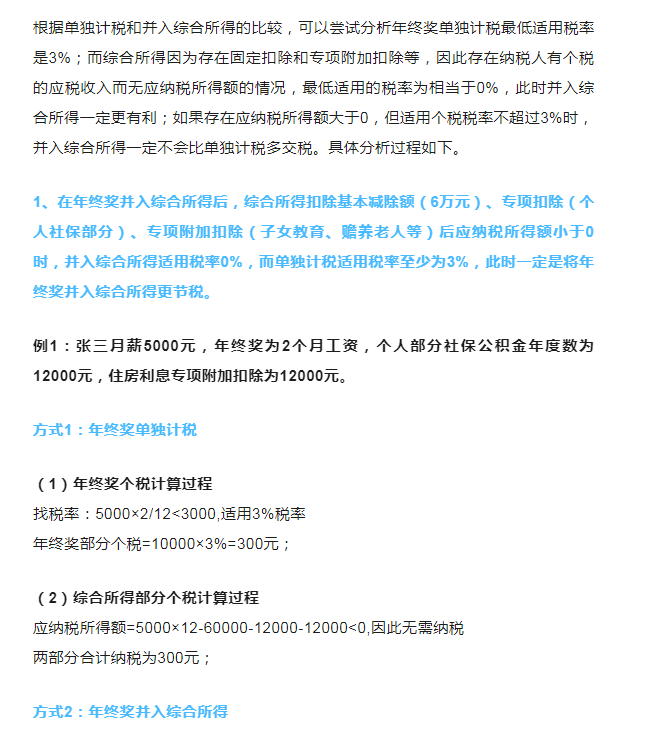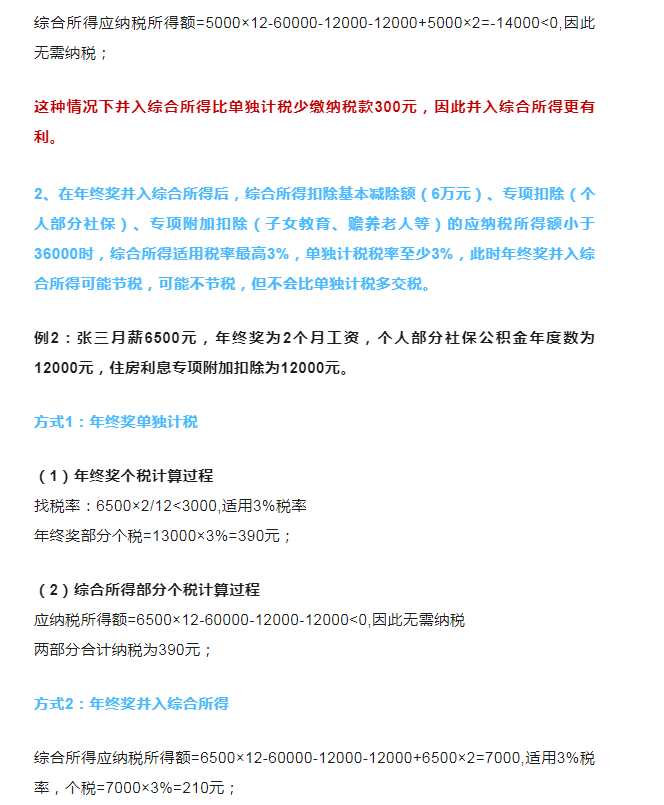 而當年終獎并入綜合所得后應納稅所得額超過36000元時,此時應當考慮年終獎單獨計稅,因為綜合所得稅率存在部分適用10%檔,而年終獎單獨計稅可能適用3%,存在節稅籌劃空間。