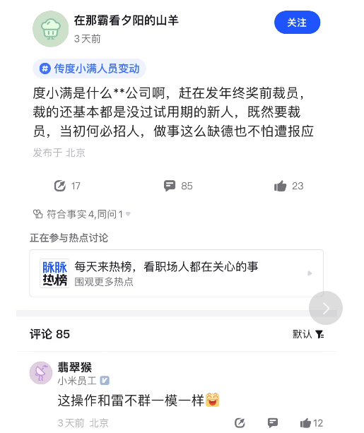熱搜的原因一樣,也是年底裁員的傳聞。