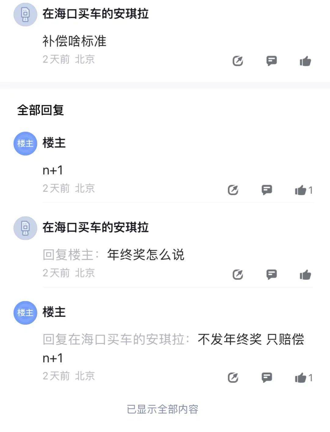 關于補償問題,有用戶表示:目前為N+1,但是年終獎沒有了。