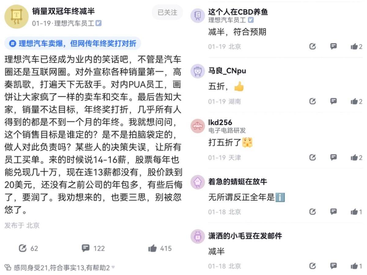 這條帖子發布后,感同身受的員工有21位,認為符合事實的有13位,評論區也有不少理想員工現身說法,表示今年自己的年終獎都打了個對折,一位負責理想汽車整車物流的員工表示,像自己這種底層員工連年終獎都沒有。
