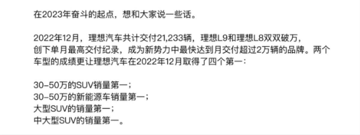 1月28日,李想發布全員信指出,2022年是理想的逆襲之年。12月,理想L8和理想L9交付量雙雙破萬,成為新勢力中最快月交付量達到2萬輛的品牌。